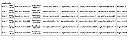 Size Details: Size:2T ?Label Size:2T ?Bust(Shirt):52cm/20.4" ?Bust(Coat):56cm/22" ?Sleeve(Coat):29cm/11.4" ?Length(Coat):42cm/16.6" ?Length(Shirt):34cm/13.4" ?Length(Pants):50cm/19.8" ?Height:90CM Size:3T ?Label Size:3T ?Bust(Shirt):54cm/21.2" ?Bust(Coat):58cm/22.8" ?Sleeve(Coat):31cm/12.2" ?Length(Coat):44cm/17.4" ?Length(Shirt):36cm/14.2" ?Length(Pants):53cm/21" ?Height:100CM Size:4T ?Label Size:4T ?Bust(Shirt):56cm/22" ?Bust(Coat):60cm/23.6" ?Sleeve(Coat):33cm/13" ?Length(Coat):46cm/18.2" ?Length(Shirt):38cm/15" ?Length(Pants):56cm/22" ?Height:105CM Size:5T ?Label Size:5T ?Bust(Shirt):58cm/22.8" ?Bust(Coat):62cm/24.4" ?Sleeve(Coat):35cm/13.8" ?Length(Coat):48cm/19" ?Length(Shirt):40cm/15.8" ?Length(Pants):59cm/23.2" ?Height:110CM Size:6T ?Label Size:6T ?Bust(Shirt):60cm/23.6" ?Bust(Coat):66cm/26" ?Sleeve(Coat):37cm/14.6" ?Length(Coat):50cm/19.8" ?Length(Shirt):42cm/16.5" ?Length(Pants):62cm/24.4" ?Height:115CM Size:7T ?Label Size:7T ?Bust(Shirt):62cm/24.4" ?Bust(Coat):68cm/26.8" ?Sleeve(Coat):39cm/15.4" ?Length(Coat):52cm/20.6" ?Length(Shirt):44cm/17.3" ?Length(Pants):65cm/25.6"Height:120CM About Commodities:? ★1. There may be a little difference of the color between the picture and the real goods because of the pixel. We hope you can understand sincerely. ★2. Please allow slight deviation for the color and measurement. Thanks. ★3. The goods will be delivered to you about18-25 days, if you need it in urgency you can choose DHL, the delivery time is 3-5 days. Please contact us if you have question about the delivery ★4.My store updates often, you are welcome to visit here at any time. ? 0 |
