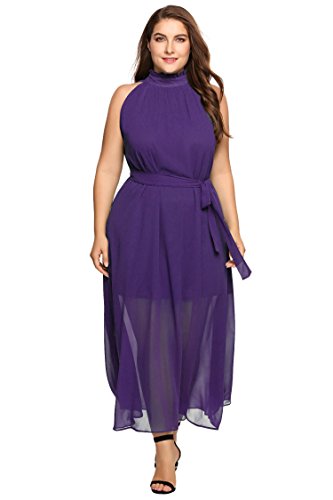 Women Plus Size Chiffon Halter Sleeveless Solid Belted Maxi Dres