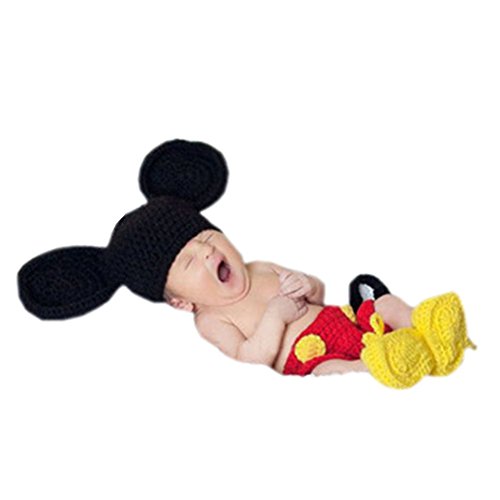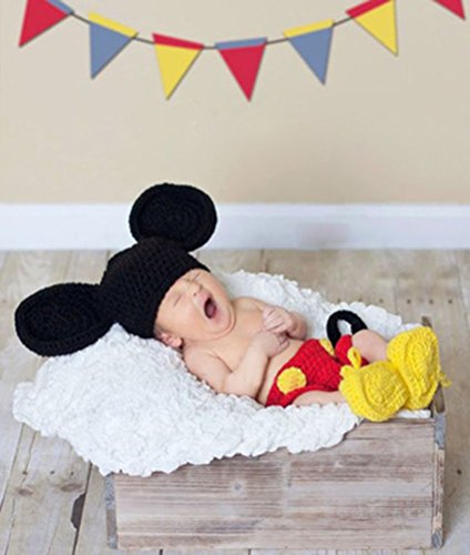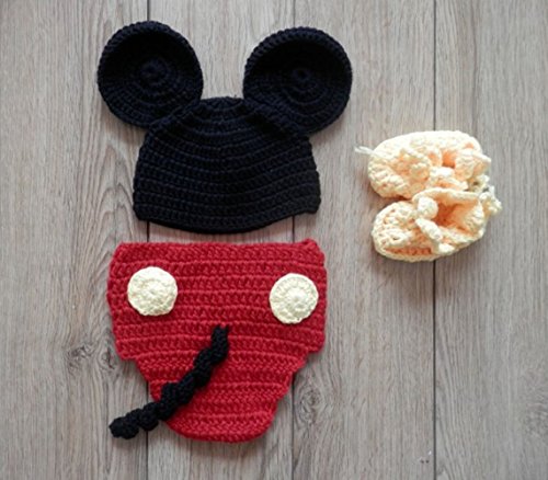 -. Brand : Bunny Dear -. Department : unisex-baby -. Feature : High quality with cotton, these crochet knitted clothes are hand made, breathable and beautiful to wear. / They are cute designed with Mickey Mouse modelling with big ears. The classic match of black, red and yellow color will make your baby cute. / Perfect for wearing in many occasion, such as baby shower, birthday party or taking photograph. / Two sizes for baby of 0-1 month and 3-4 months. / Package: 1 x skirt, 1 x hat, 1 x shoes -. ProductGroup : Apparel -. ProductTypeName : BABY_COSTUME -. Title : Baby Mickey Mouse Costume Crochet Knitted Big Ear Photograph Prop Three Pieces