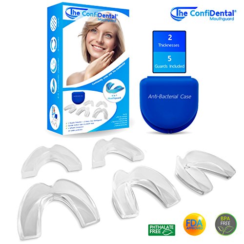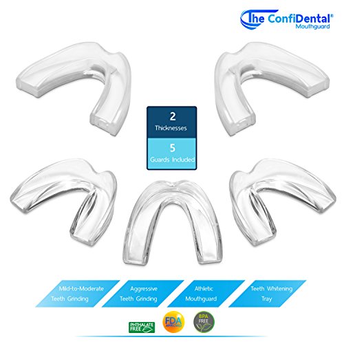 Studio : The ConfiDental Publisher : The ConfiDental Binding : Misc. Product Description The ConfiDental Dental Guard, Moldable Dental Protectors - Pack of 5 The ConfiDental Dental Guard is an excellent dental appliance made from high-quality premium dental grade materials. The guard is BPA-free and Phthalate-Free for added protection. Available in 3mm and 6mm thicknesses so that it can get used for multiple purposes. Our ConfiDental Dental Guards are ideal for teeth clenching, mild to moderate teeth grinding, aggressive teeth grinding, bruxism. Additionally, they can be used as athletic guard and teeth whitening tray. The ConfiDental Dental Guard is a superior product that offers users a variety of key benefits: - Teeth Protection - The ConfiDental Dental Guard, either in a 3mm or 6mm thicknesses and integrated design, absorbs and redistributes the force of an impact from teeth grinding and sporting activities, preventing damage to your teeth. - Customizable Fit - Made from a thermoplastic material, users can custom mold their guard for a perfect fit in the privacy of their home. - Maximum Comfort - The ConfiDental Dental Guard features a frenulum notch design that prevents irritation. - Tear Resistant and Durable - Easy to Clean and Reusable - Safe to Use - They are manufactured using BPA free and Phthalates free premium grade moldable material, for added safety and customer satisfaction. Package Includes: - 3 pieces of 3mm thick ConfiDental Dental Guards - 2 pieces of 6mm thick ConfiDental Dental Guards - 1 Travel Hygiene Case - Step-by-step instructions for the molding and fitting process