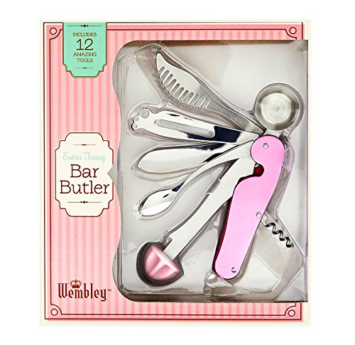 -. Feature : Includes a dozen indispensable bar tools / Features stainless steel construction / Folds away for easy storage / Metallic pink finish / Perfect Gift