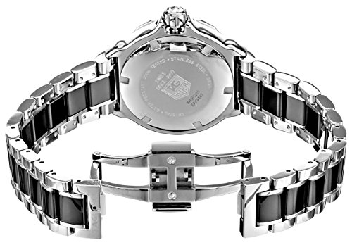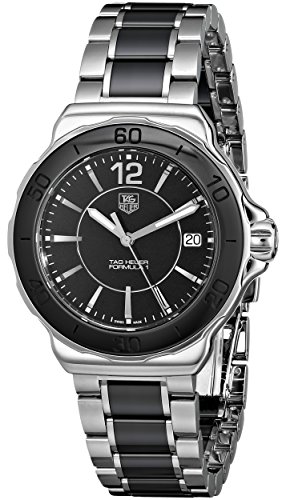 Steel case with a steel bracelet with black ceramic center links. Black ceramic bezel. Black dial with silver-tone hands and stick hour markers. Arabic numeral marks the 12 o'clock position. Minute markers around the outer rim. Date displays at the 3 o'clock position. Quartz movement. Scratch resistant sapphire crystal. Case diameter: 37 mm. Deployment clasp. Water resistant at 200 meters/ 660 feet. Functions: hours, minutes, seconds, date. Tag Heuer Formula 1 Lady Ceramic Watch WAH1210.BA0859.Feature