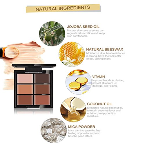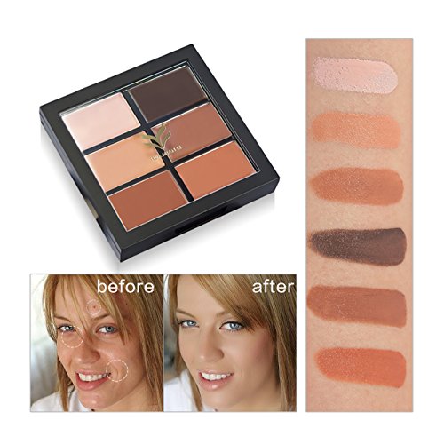 -. Feature : 3 Optional Palette,total of 18 colors can be perfectly mixed and matched any different skin complexion( light,medium or dark) / Waterproof and Long Lasting : With natural, gentle and nourishing formula, it can maintains the perfect look all day long. It is perfect for professional salon, wedding, party or home use. / Provide total camouflage for almost any skin problem (blemishes,acnes,cars,birthmarks, fine lines and black circles) / Great Coverage,P.R.Iming skin for makeup and improving your skin / Package includes:1× 6 colors concealer palette