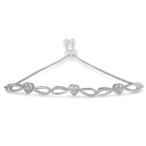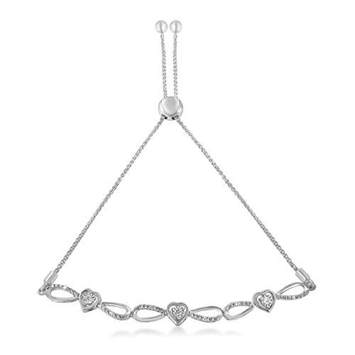 Express your affection to her with this dazzling bolo bracelet. It is crafted of sterling silver and features 3 interlocking hearts with infinity accents that are adorned with sparkling round cut diamonds. It comes with a bolo clasp that allows you to adjust the chain of a bracelet according to your wrist.