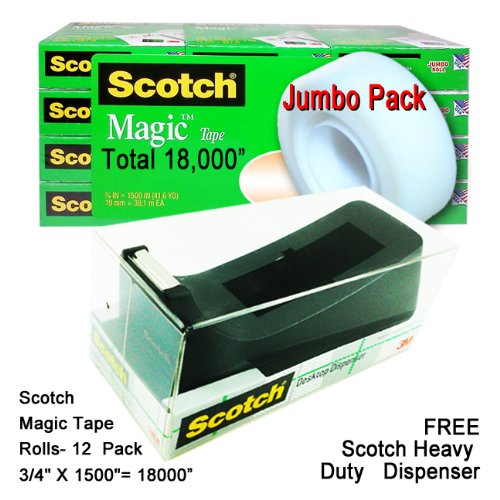 Scotch Magic Tape, ea. 3/4 x 1500 Inches, 12 Jumbo Rolls Bonus Refillable Dispenser