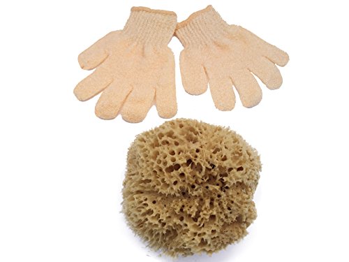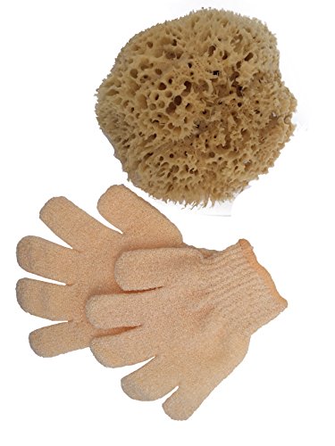 Wool Sea Sponge and Bath Glove – 2 Item Bundle of 5”-6” Natural Wool Sea Sponge for Bathing and Showering, and a Pair of Exfoliating Bath Gloves
