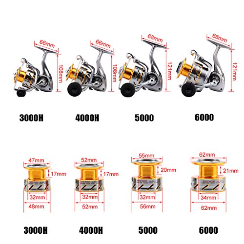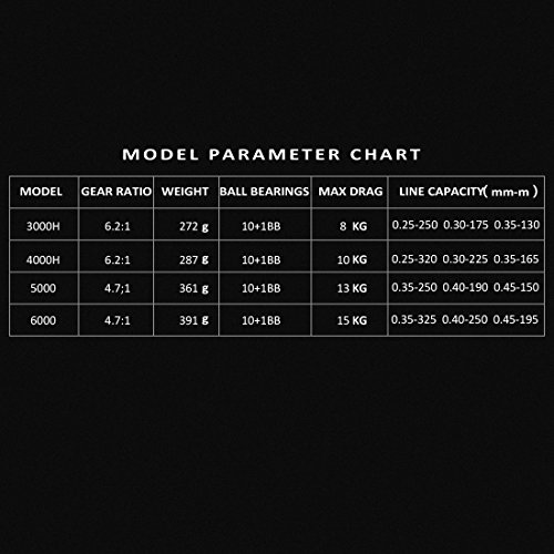 -. Feature : 1. New Rapid saltwater big power spinning fishing reel. Anti-corrosive Coating saltwater reel with max 15kg power drag keep you enjoying sea fishing. / 2. Enhanced thicker main shaft and stainless ball bearing, carbon fiber drag system gives Rapid 15kg/33Lbs of massive power to fight with big fish. / 3. Exquisite craftsmanship, advanced production technology and high quality 10 + 1 shielded stainless steel ball bearings make Rapid works smoothly. / 4. Special design aluminum spool and rotor structure has a good function in preventing water and sand. / 5. Variety use especially for fishing beginners, it fits for kinds of situations.