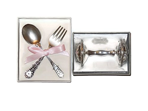 -. Binding : Baby Product -. Brand : Mix brands -. Color : Silver -. EAN : 0769272860124 -. Feature : This bundle includes a classic keepsakes silver-plate rattle and a keepsakes feeding set / Rattle measures 2" diameter x 4" long and arrives in an acetate gift box / Vintage style silverplate keepsake feeding spoon and fork set / Stamped with love u sweet baby on the handles of the spoon and fork / Perfect baby keepsakes gifts for christening, baptism, birthdays, baby shower or other special event -. IsAdultProduct : 0 -. Label : Mix manufacturer -. Manufacturer : Mix manufacturer -. ProductGroup : Baby Product -. ProductTypeName : BABY_PRODUCT -. Publisher : Mix manufacturer -. Studio : Mix manufacturer -. Title : Mud Pie Baby Classic Keepsakes Silver-Plate Rattle Bundle With Baby Girl Keepsakes Feeding Set, Perfect Christening-Baptism-Baby Shower Gift Boxes For Girls -. UPC : 769272860124