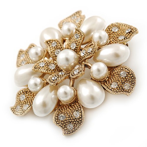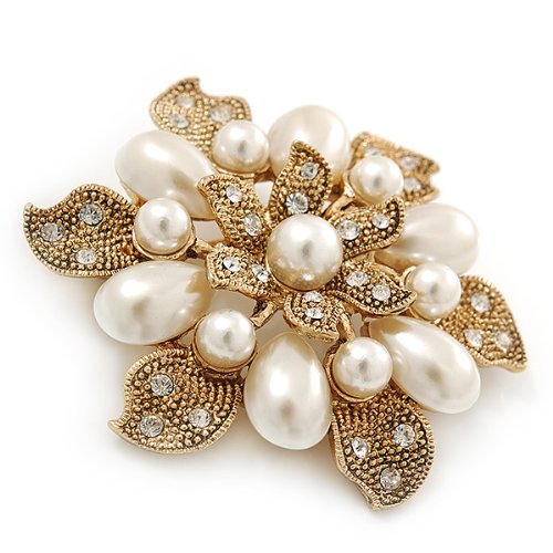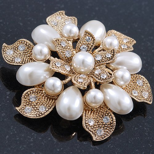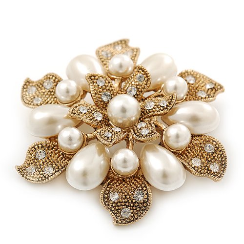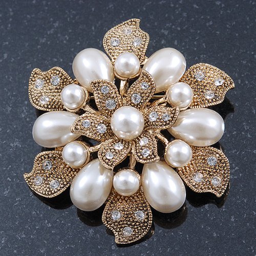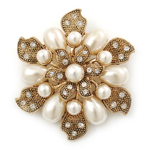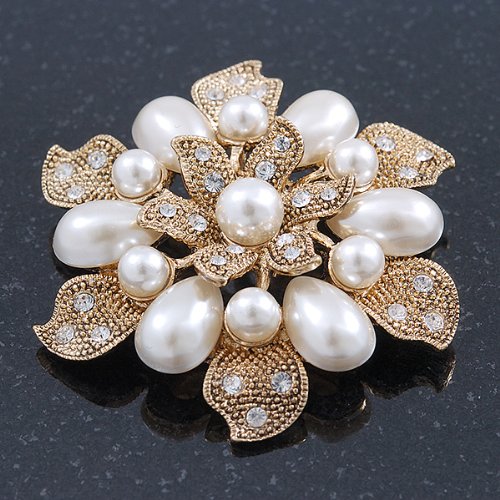 Vintage inspiration gives you of-the-moment thrills. This ultra-feminine piece seamlessly incorporates old Hollywood glamour into your everyday style. Featuring a layered flower design, crafted in gold plated metal and decorated with white glass pearls and small clear Swarovski crystals for a dash of sparkle. The brooch measures about 55mm in diameter. Secures with a flag pin and revolver clasp. This stunner would make an exquisite gift for someone special and would look just divine pinned at the waist of a vintage style wedding gown. This product does not contain any natural pearls.Feature