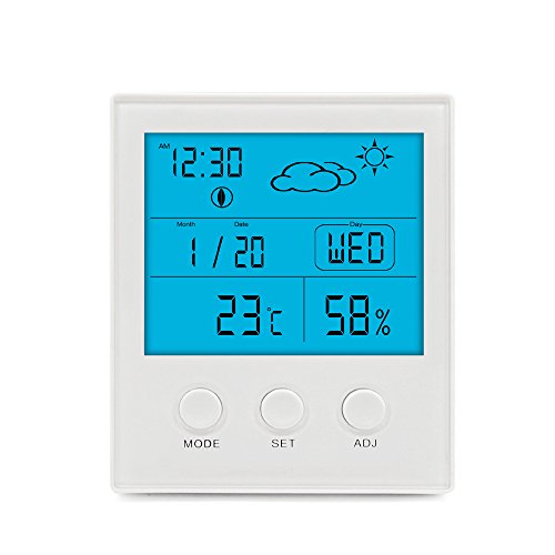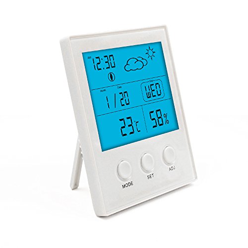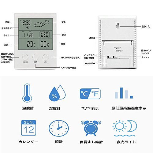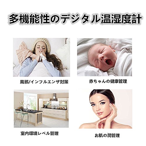 -. Feature : ★サイズ:(約)11.4cm×9.35cm×2.2cm。 本体重量:130g。 / ★バックライトあり:温度湿度計はバックライトがあるので、暗い場所でも時間などがはっきり見えます。家庭用としては極めて高いクオリティで温度や湿度をしっかりと教えてくれます。デザインは至ってシンプルなので、リビングや書斎、ベッドルームなど場所も選ばず置いて頂けます。 / ★大画面、見やすい:大きな液晶パネルに時刻、日付、正時お知らせ、温度、湿度を表示できる。赤ちゃんの健康管理、インフルエンザや風邪などの予防対策、お肌への潤い環境チェック、カビ対策、熱中症対策などにも役立ちます。 / ★ワンタッチでスヌーズ開始するデジタル温湿度計:アラームが設定可能、スヌーズ機能もあるので、早起き、スケジュール、デートの管理に非常に役に立ちます。 / ★置き掛けタイプ:室内温度湿度計は卓上スタンド・壁掛け用フック穴が付いているので、自宅の様々な場所に設置出来ます。