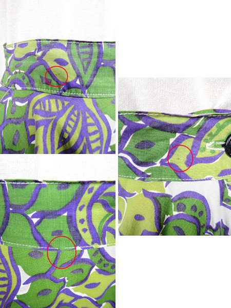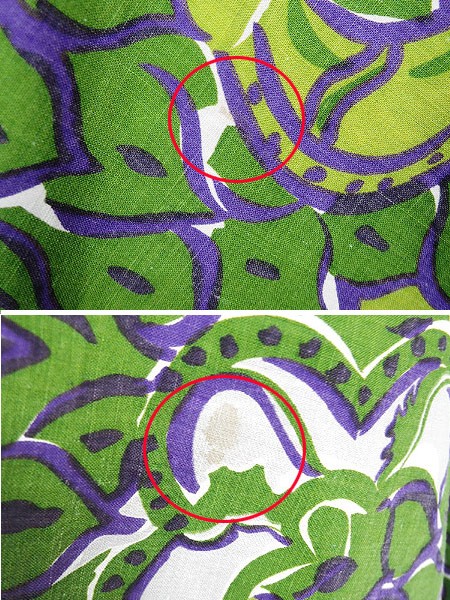 裾はミシン縫いの始末。裏地なし、ポケットあり。ウェストサイズ直し跡あり、中央にステッチ落ちあり。ウェストボタン付近に汚れ、小穴開きあり。ウェスト右付近にヨゴレあり。左脇付近など全体に糸引きダメージあり。前中央付近に汚れあり。