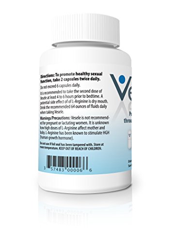 What is Vesele®: Vesele® is a dietary supplement designed to maximize the benefits of Nitric Oxide, which relaxes blood vessels to allow for healthy blood flow throughout the body. Vesele® contains two amino acids: L-Citrulline and L-Arginine, plus a patented piperine extract called BioPerine®, that helps the body absorb these amino acids. At the correct dosing levels, these nutrients have a well-recognized benefit in boosting blood flow throughout the body. Vesele® is a supplement and is not a replacement of single use pills or other PDE5 inhibitors. Vesele® was studied in 76 patients who took the product over a 4-month period. The product should be taken as two capsules in the morning and two capsules in the afternoon daily and continuously for four months to see the benefits observed in the clinical trials. Vesele® is not a product that is taken before sexual intercourse and works with taking one pill or by taking the product for a short period of time. Vesele® contains Arginine and in order for Arginine to take effect and be present in enough levels in the body to produce enough nitric oxide to relax the blood vessels involved in the hardness process, the product NEEDS to be taken daily for a period of continuous months.Feature
