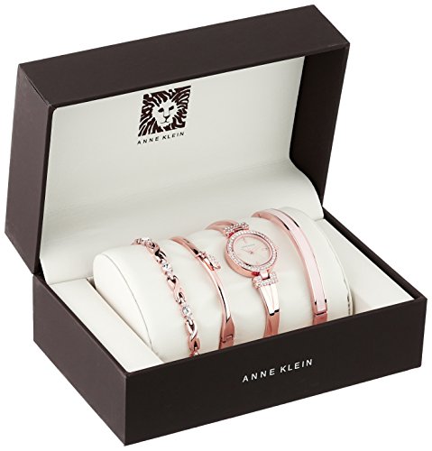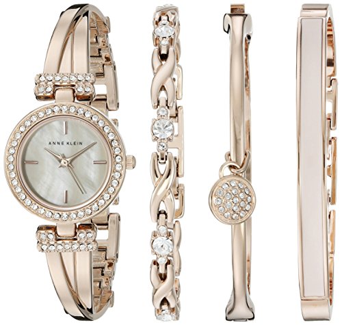 -. Binding : Watch -. Brand : Anne Klein -. Color : Rose Gold/Pink -. Department : womens -. EAN : 0086702570867 -. Feature : Rose gold-tone watch featuring blush mother-of-pearl dial and sparkling Swarovski crystal rounds / Set includes X-link bracelet accented with Swarovski crystals, polished bracelet with Swarovski crystal-studded charm, and bangle with pink enamel fill / 24-mm metal case with mineral dial window / Japanese quartz movement with analog display / Alloy bracelet with jewelry-clasp closure / Water resistant to 30 m (99 ft): In general, withstands splashes or brief immersion in water, but not suitable for swimming -. Label : AK Anne Klein -. Manufacturer : AK Anne Klein -. Model : AK/2238RGST -. MPN : AK/2238RGST -. PackageQuantity : 1 -. PartNumber : AK/2238RGST -. ProductGroup : Watch -. ProductTypeName : WATCH -. Publisher : AK Anne Klein -. Studio : AK Anne Klein -. Title : Anne Klein Women's AK/2238RGST Swarovski Crystal-Accented Rose Gold-Tone Bangle Watch and Bracelet Set -. UPC : 086702570867