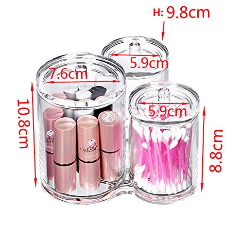 Jwest Premium Quality Makeup Organizer Container with Lids [All-Purpose] Cotton Ball and Swab Brush Holder Clear Plastic Acrylic Triple Round Jars - 3in1