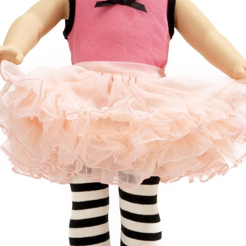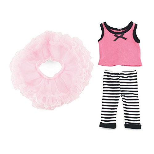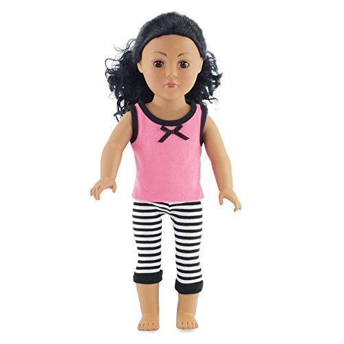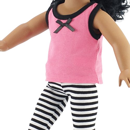 Product Description *Doll not included Your 18 inch doll is having fun in this pretty in pink outfit. This outfit that fits your American Girl Doll includes 3 fun pieces at a great price. Your doll will love the dark pink tank top with black satin ribbon and trim and striped leggings. 0
