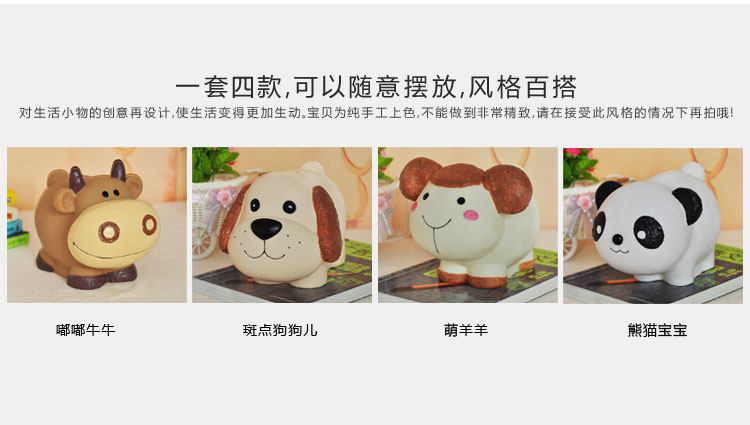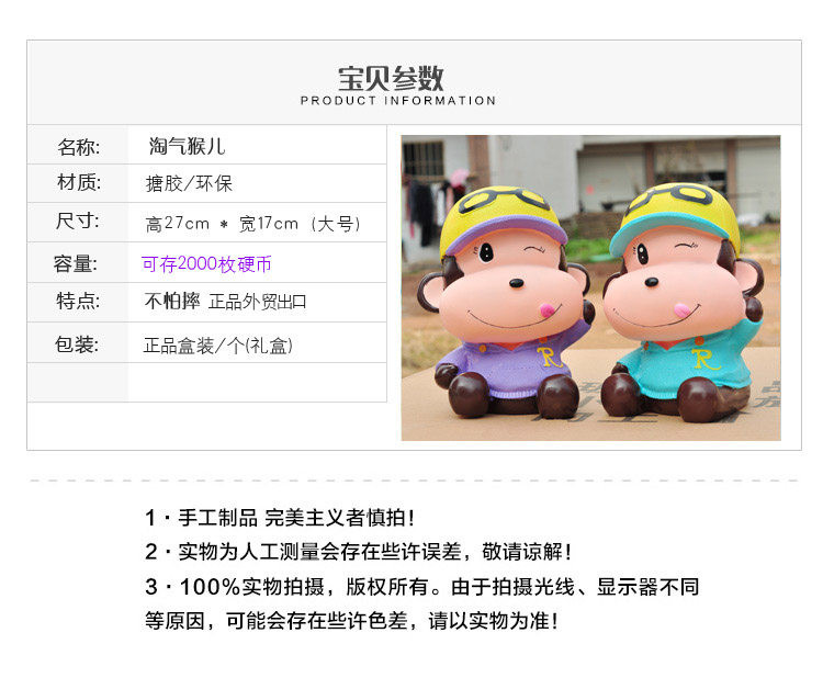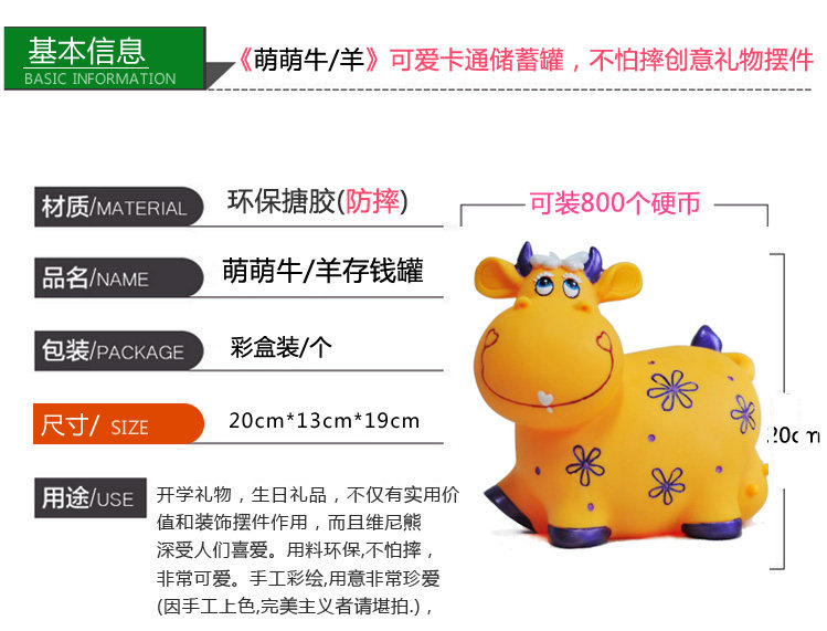 Gross weight: 420g Material: vinyl 【Material】: advanced vinyl (drop) 【Packing】: opp bags + color box Cattle and sheep models: long 20cm wide 13cm high 19cm can save 800 coins, Doodle cow / panda / dog models: long 20cm wide 13cm high 16cm can save 800 coins, Big cock: 24cm long and 11cm high 15cm can hold 1000 coins, Rabbit: 23cm long and 18cm long can hold 1000 coins, Monkey: 25cm long and 19cm can store 1-2000 coins,