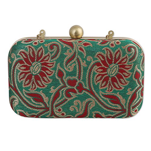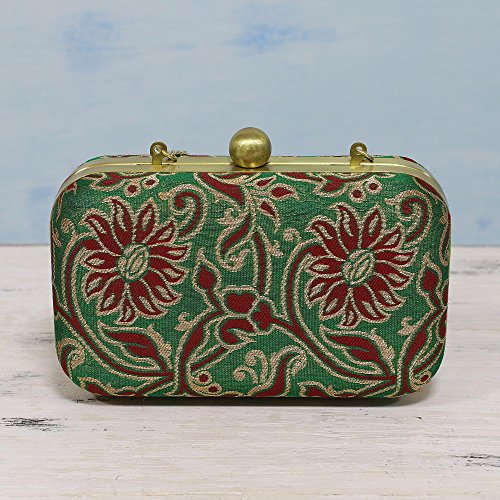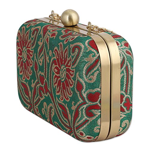 About this item: A beautiful floral brocade pattern in scarlet adorns a kelly green base, with golden zari thread highlighting the design. Indian artisan Harpreet Kaur designs this exquisite evening bag, which features an emerald green cotton lining. A brass-plated chain shoulder strap can be conveniently tucked inside the bag to carry as a clutch if desired.