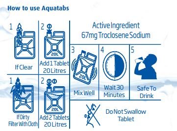 Studio : Medentech Publisher : Medentech Product Description Aquatabs® is a tablet which is added to drinking water to kill most harmful micro-organisms. The tablet dissolves clear within minutes and disinfects the water within 30 minutes. Aquatabs® tablets are available in 67mg. The tablets are presented in strips of 10 tablets with a shelf life of 5 years or tub packed with a shelf life of 3 years. Aquatabs will lead to a 99.9999% reduction in bacteria, a 99.99% reduction in viruses and a 99.9% reduction in Cysts (Giardia) within 30 minutes when used in non-turbid water. Each tablet is dissolved in a specified volume of water according to the following dosage chart. 0
