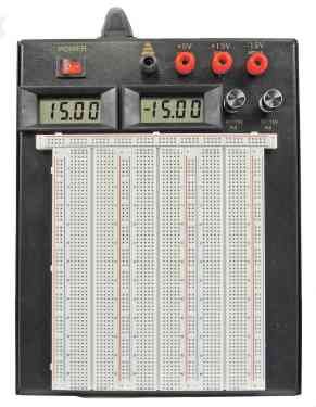 -. Feature : LCD Display with Illuminated Power Switch / Two LCD voltmeters show 0-15V positive and 0-15V negative outputs / DC Power Supplies: +5@1A; variable 0 to ±15V@500mA / Input Power: 120VAC @ 60Hz / 5 distribution and 3 terminal strips (2390 tie points)