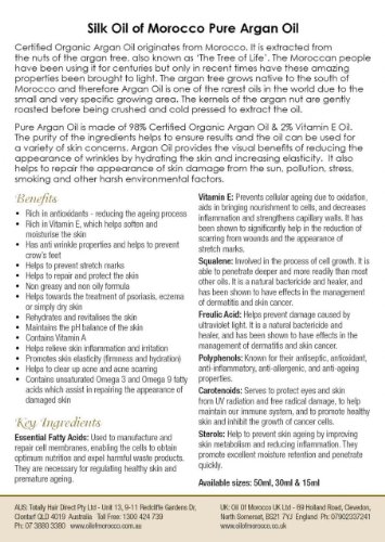 -. Feature : Silk Oil of Morocco Pure Argan Oil 50ml for Hair & Skin / Pure Argan Oil helps to repair the appearance of damage caused by heat, styling, colouring and aggressive environmental factors, / It also helps to combat the impact of the sun, pollution, stress, smoking and environmental factors on the appearance of our skin and hair. / Argan Oil contains 700 mg of Vitamin E per kilogram which is twice the amount that is found in Olive Oil / Argan Oil provides the visual benefits of reducing the appearance of wrinkles by softening the skin and increasing elasticity.