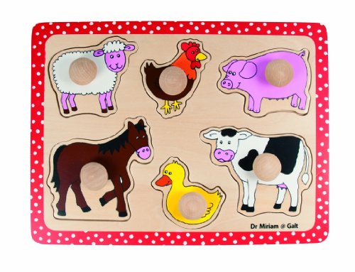 A wooden tray peg puzzle with 6 lift-out farmyard animals. The chunky pegs are ideal for a young child to hold as they pick up the animal and match the shape to the space in the tray.