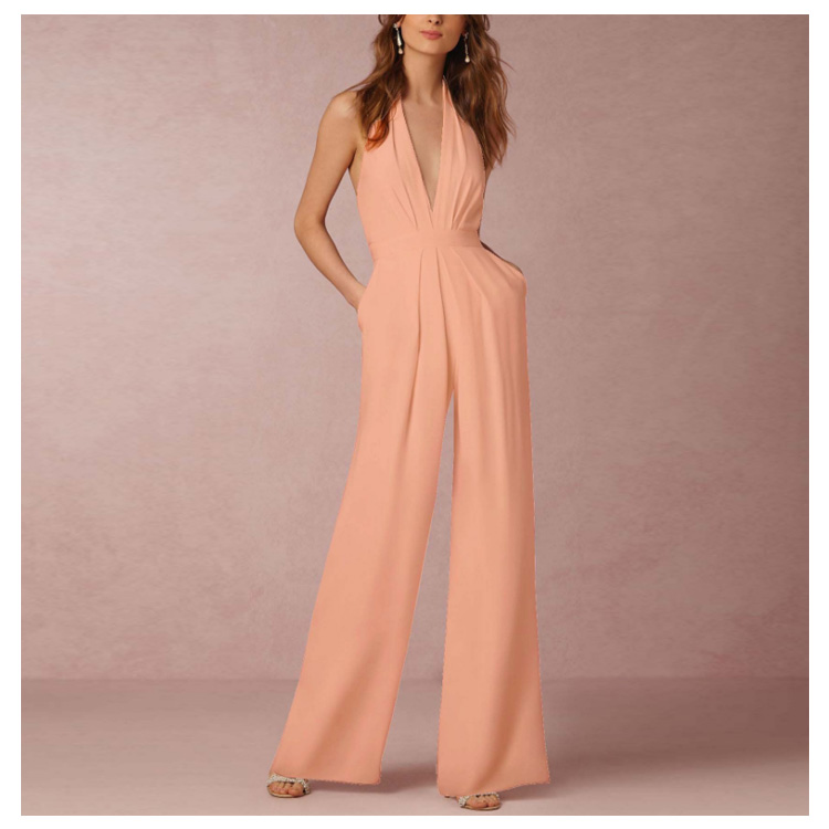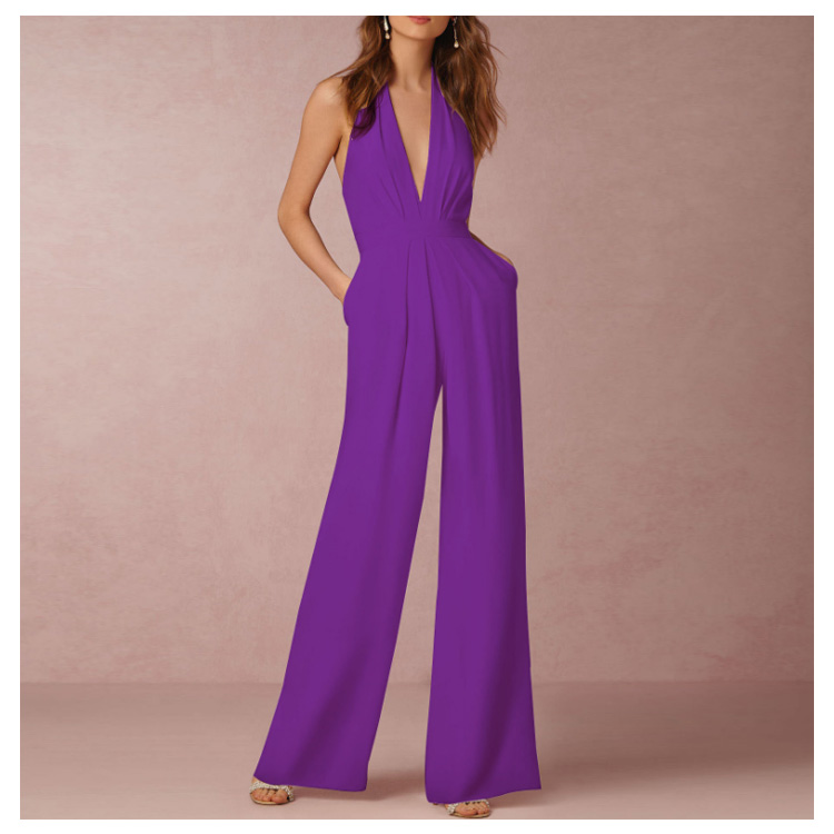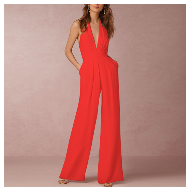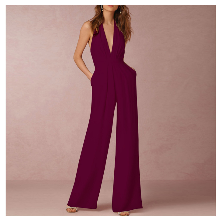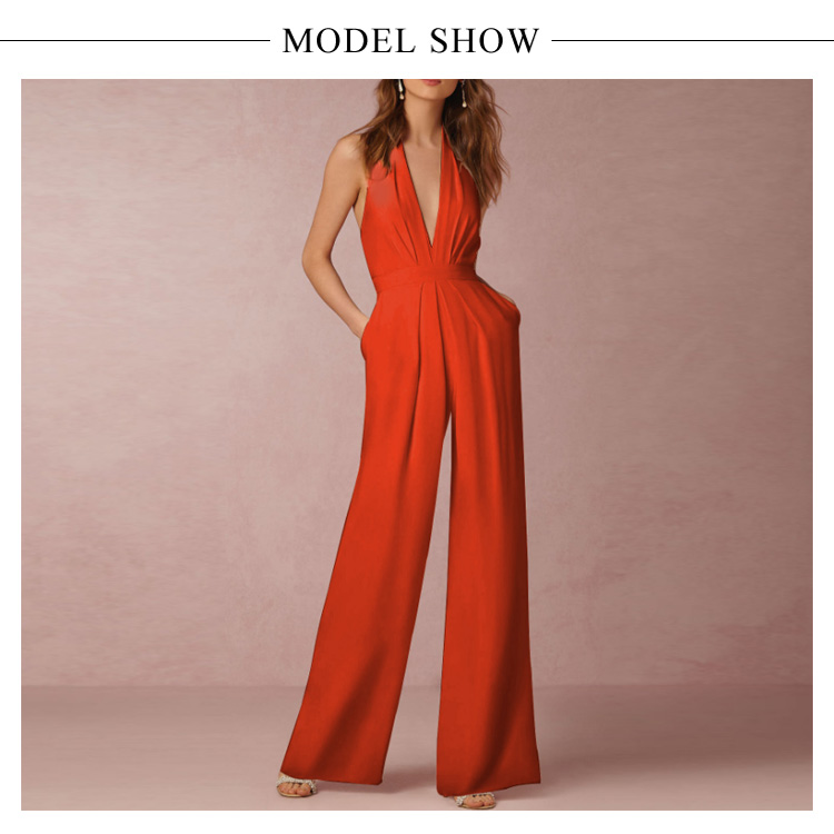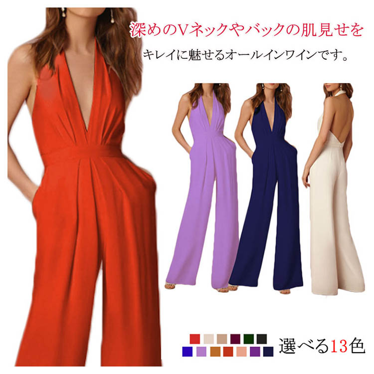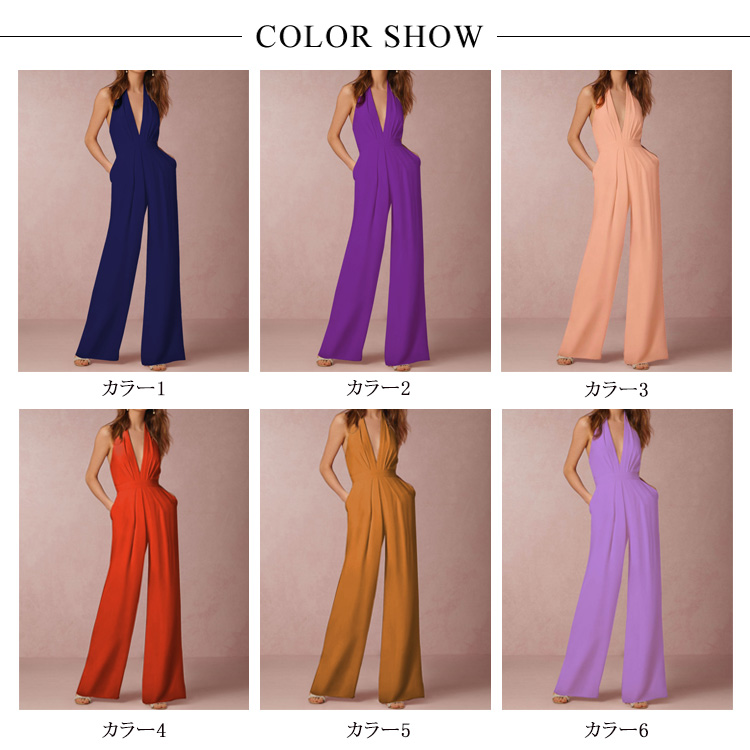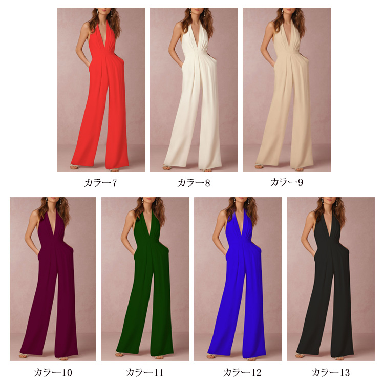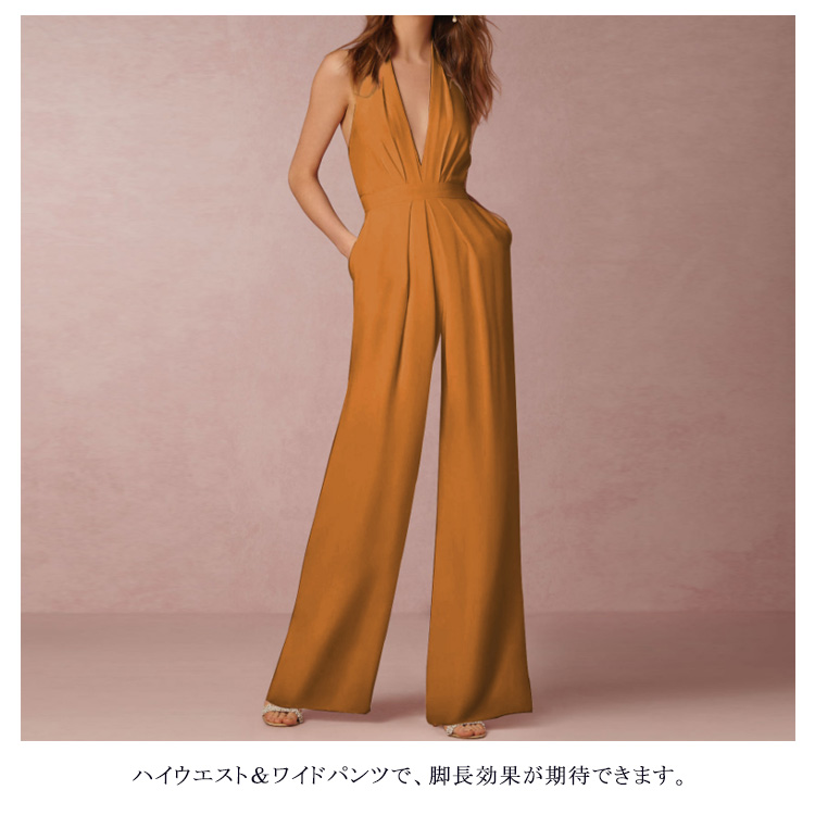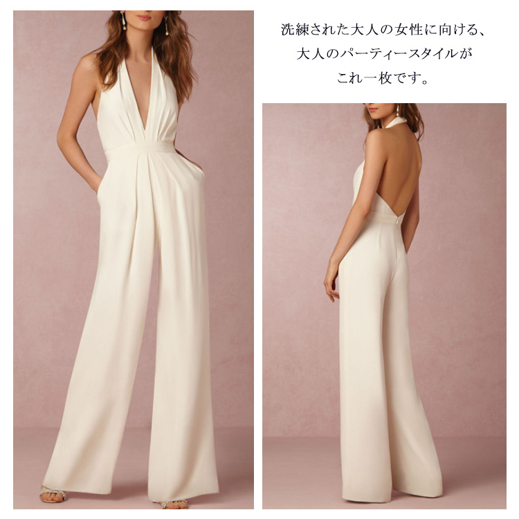 | 深めのVネックやバックの肌見せをキレイに魅せるオールインワインです。すっきりとしたシルエットは女性らしい印象を高めます。ハイウエスト&ワイドパンツで、脚長効果が期待できます。洗練された大人の女性に向ける、大人のパーティースタイルがこれ一枚です。 | |