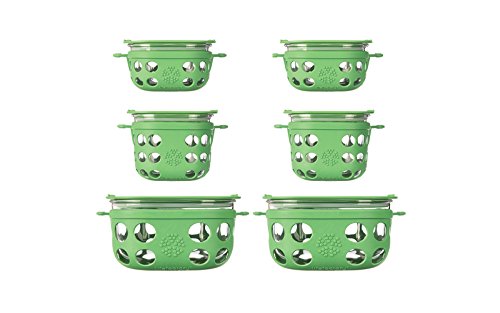 Tempered glass containers and silicone sleeves on are oven, microwave, freezer, and dishwasher safe