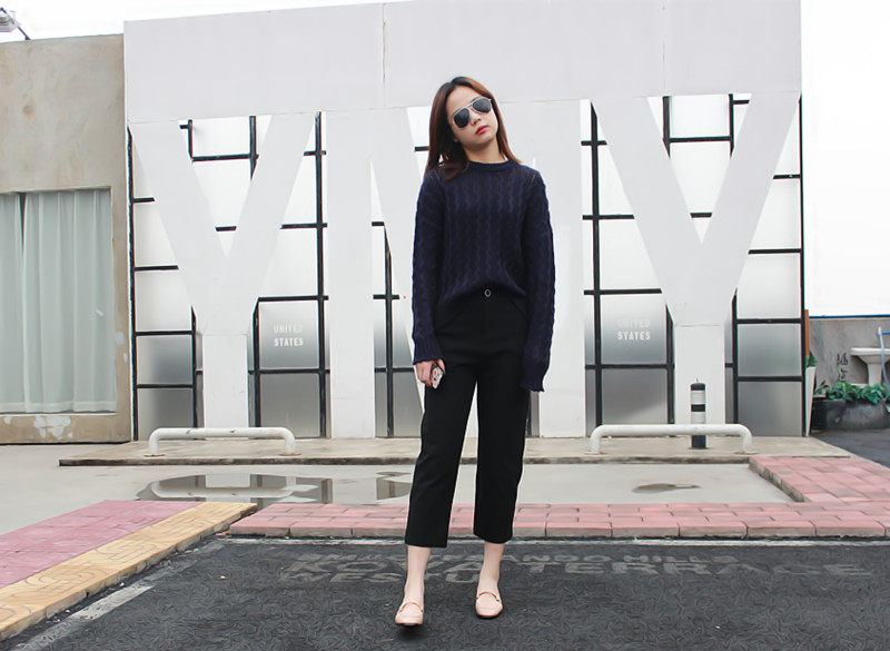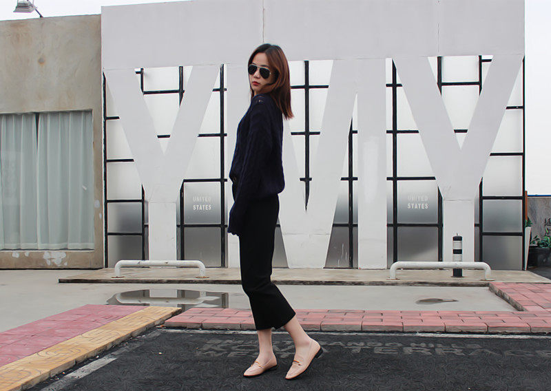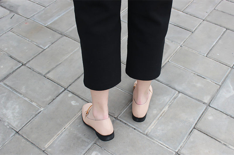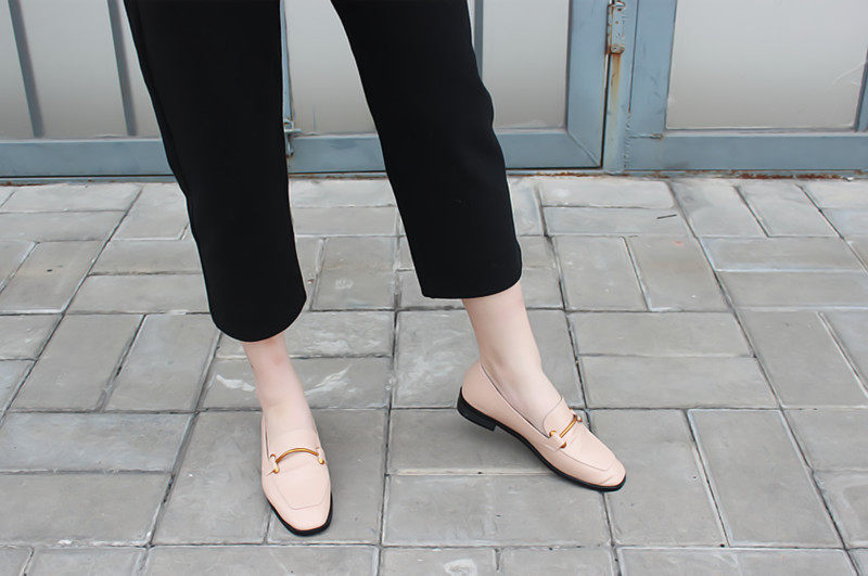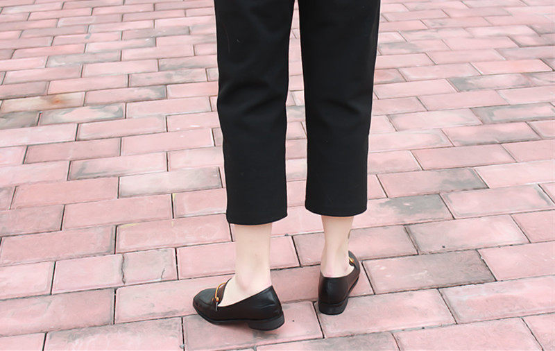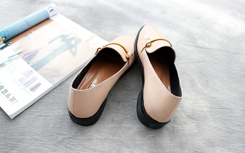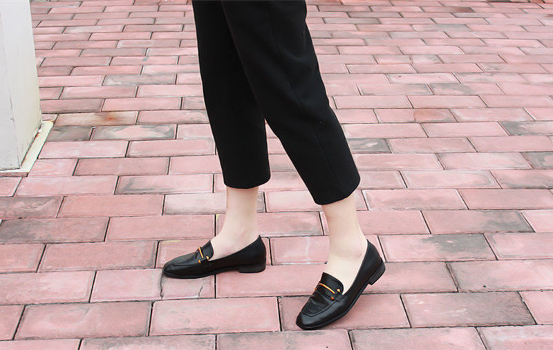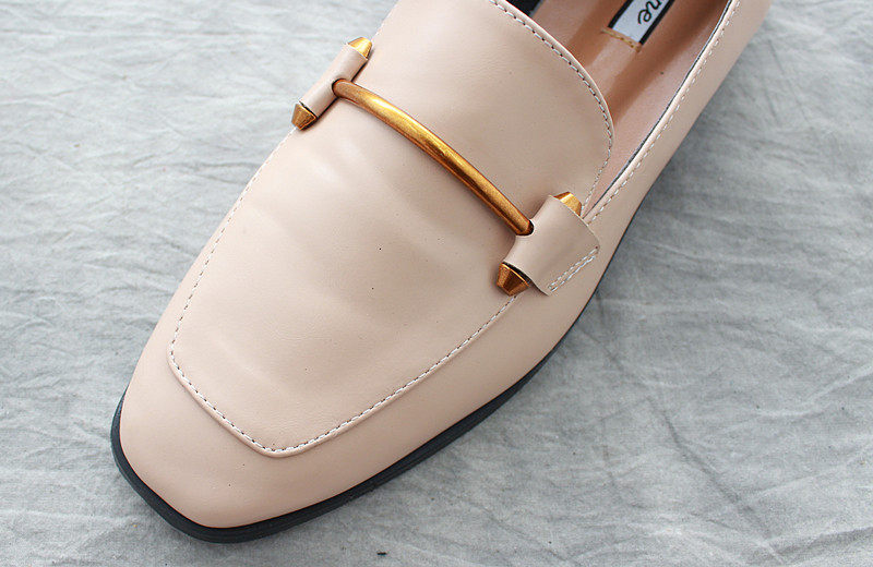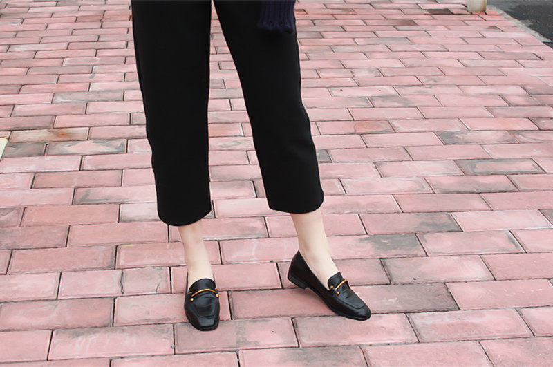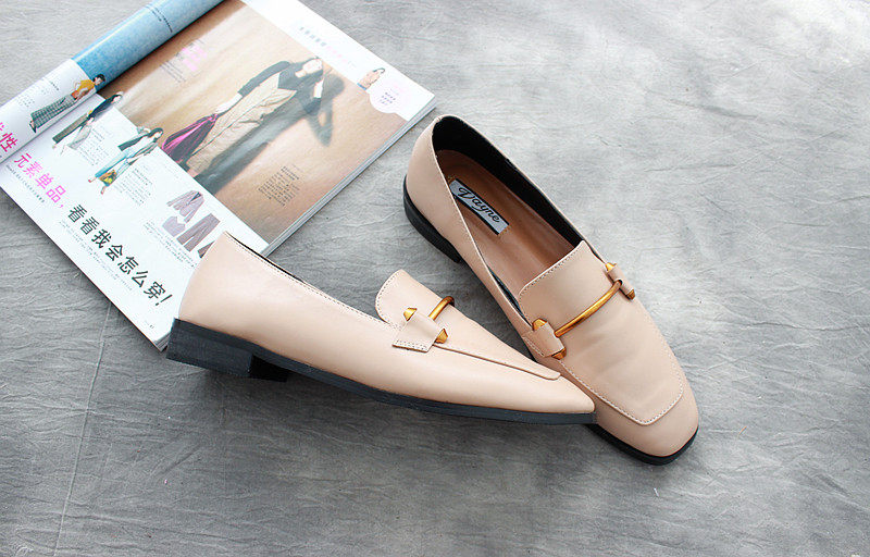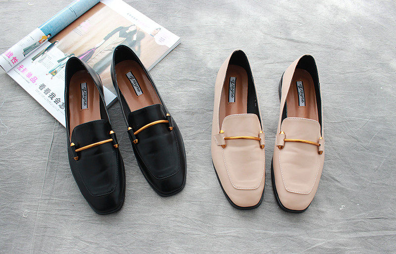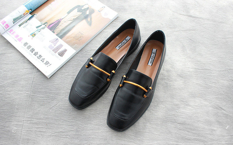 春季新款一字金属扣单鞋女百搭低跟小皮鞋复古小方头乐福鞋女