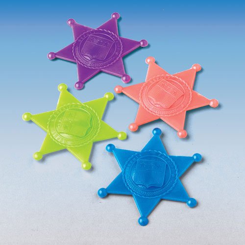 -. Binding : Toy -. Brand : CoolGlow -. Color : ASSORTED -. Department : BOYS -. Feature : Lot Of 24 / Assorted Colors / Size: 2.75" / Made Of Plastic -. Label : US Toy -. Manufacturer : US Toy -. MPN : 37743 -. PackageQuantity : 1 -. PartNumber : 37743 -. ProductGroup : Toy -. ProductTypeName : TOYS_AND_GAMES -. Publisher : US Toy -. Size : 2.75" -. Studio : US Toy -. Title : Jumbo Sheriff Badges