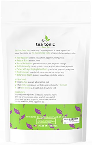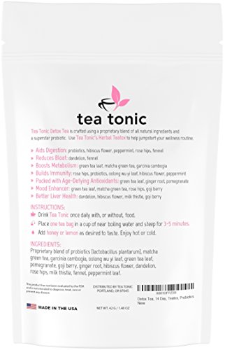 TODAY IS THE DAY TO START WORKING ON THE NEW YOU! Let Tea Tonic's Liver Detoxifying, Bloat Beating and Metabolism Boosting tea be your secret weapon Tea Tonic's liver detoxifying ingredients help remove the toxins in your body and cleanse your liver letting it do what it's supposed to do. So how does Tea Tonic boost your metabolism and help you decrease weight? Japanese studies showed that a cup of brewed tea, with metabolism boosting ingredients like green tea, can raise your metabolism by 12%. The studies believe the antioxidant catechins in tea provides the boost. Tea Tonic is packed with both green tea and matcha green tea for a more productive metabolism. Probiotics to stay healthy on the inside! Tea Tonic is the only Detox Tea on the market with the Superstar Probiotic Lactobacillus Plantarum, giving your gut the help it needs to keep your inside working like clockwork. As an added bonus, probiotics boost your immune system too. Now that's a win-win. Money Back Guarantee Buy now, decide later. If you are not completely satisfied with our detox tea, simply contact us and we'll give you a full refund. "I really like this tea, found it to be very natural tasting, not over powering and leaves you feeling like you are really doing something good for your body and mind!" - Carmen, reviewed on 7/17 Made in the USA With a Money-Back Guarantee You Have Nothing To Lose; So Scroll Up To The Top, Click "Add to Cart" and Get Your Tea Tonic 14-Day Teatox Detox To Your Door In 2 Days! 0 |