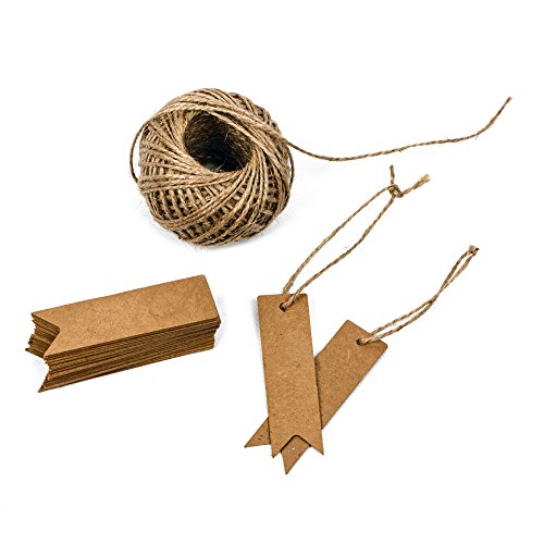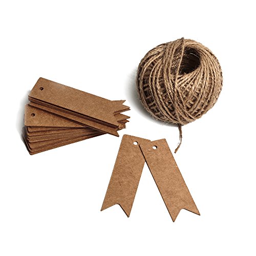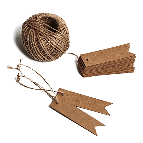 KINGLAKE 100PCS Kraft Paper Gift Tags with String Vintage Wedding Hang Price Tags 2.75" x 0.78" with 100 Feet Natural Jute Twine
