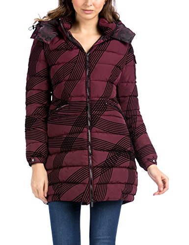 Zip-front puffer jacket in allover wavy crossing stripe pattern featuring drawstring hood and applique at sleeve cuff