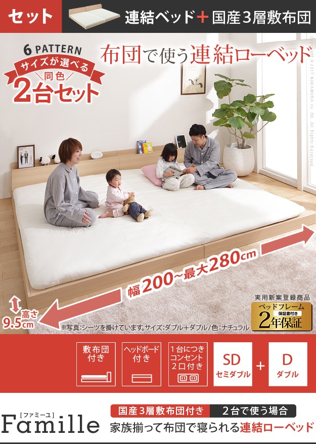 ●連結ベッド ベッドフレーム ロースタイル スリムヘッドボード 2口コンセント 敷布団 敷きふとん 抗菌 防臭 防ダニ布団 防ダニ加工 吸汗速乾 軽い 軽量 厚い 日本製