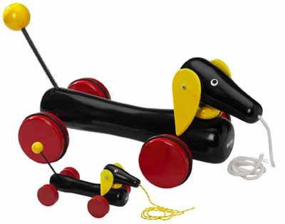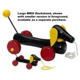 Our beloved pull along dachshund puppy is all grown up! 50% bigger than the original. This Dachshund has been a durable wooden BRIO classic since 1953. A toy to love and grow with. When your toddler takes the wooden pull-along puppy for a walk, it moves its head and ears and wags its tail just like a real dog. This is a retro toy in its original design. A real gem. It encourages early walking and co-ordination. The item measures 20" x 8" x 9" inches. Suitable for ages 18 months and up. BRIO creates innovative, high-quality and well-designed toys with clean, simple designs that spark children’s creativity and imagination while encouraging and supporting each stage of their development. For over a century, our mission has been to create happy childhood memories. All wooden parts are made from 100% FSC-certified beech wood from sustainably managed forests and are built to last for generations.Feature