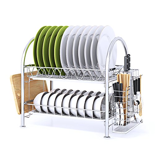 -. Feature : Product dimensions:17.51*11.22*17.12 inch. Includes plastic pan to catch the excess water¡£Please clean it daily keep cleaning. / Easy to installation: Come with installation instruction, please follow it. Any question please contact us feel free! / Fits to: Drying rack fits to put plates, coffee cups, tablewares, can make it fast and safe to dry, to keep your counter dry and clean. / Material: Drying rack are made of stainless steel 18-8, sturdy, durable and non-rust. / Package include: a piece of 18-8 Stainless Steel 2 Tier Dish Rack with Cutlery Holder and 2 Drainboard.
