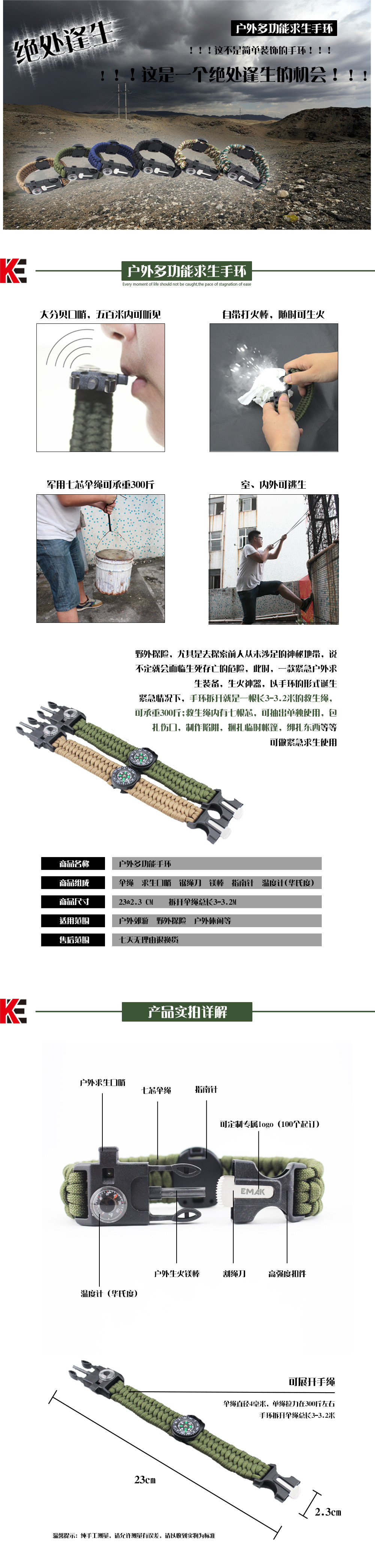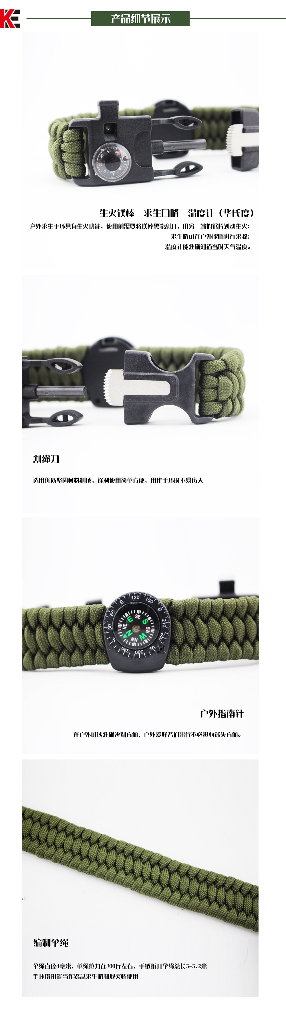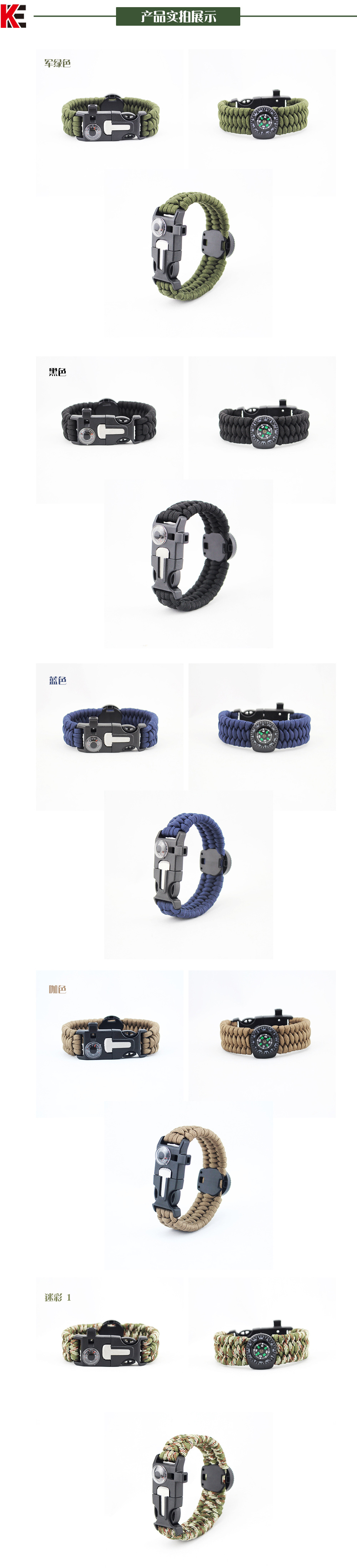 爆款户外三股求生手环 户外伞绳指南针温度计打火石逃生生存手链u0026nbsp;u0026nbsp;u0026nbsp;这不是一款普通的伞绳手链,它具有更多户外求生功能。它配备了户外救生取火石,切绳刀,求生口哨和一根长约3.5米的7芯伞绳,为您的户外探索提供安全保障。