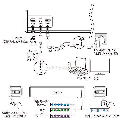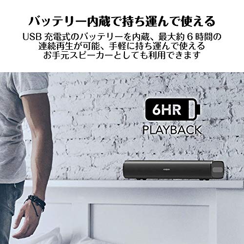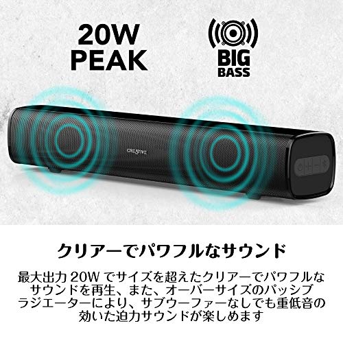 バッテリー駆動で持ち運んで使える 最大約6時間の連続再生が可能なUSB充電式のバッテリーで動作するため、据え置きのデスクトップ スピーカーとしてのみならず、手軽に持ち運んでお使い頂けるお手元スピーカーとしても利用できます。 | スピーカー単体で再生OK USBメモリーを接続可能なUSBポートを備えており、MP3ファイルの入ったUSBメモリーを接続して、スピーカー単体で音楽再生をお楽しみ頂くことも可能です。 | クリアーでパワフルなサウンド カスタム チューンのフルレンジ ドライバーを2機搭載、最大出力20Wのパワーでサイズを超えたクリアーでパワフルなサウンドを再生します。また、オーバーサイズのパッシブ ラジエーターにより、サブウーファーなしでも重低音の効いた迫力サウンドが楽しめます。 |