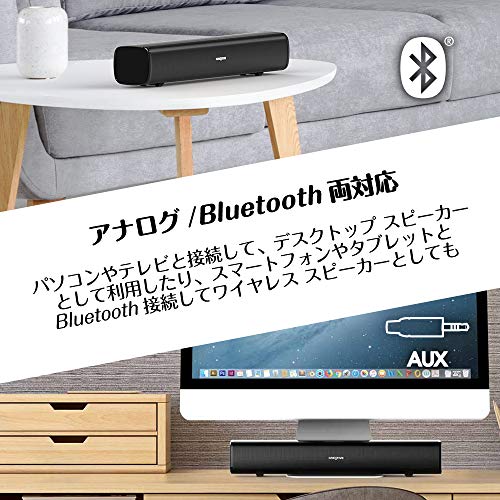 アナログ接続とBluetooth接続の両方に対応しており、3.5mmステレオ ケーブルでパソコンやテレビのヘッドホン出力と接続して、デスクトップ スピーカーとして利用したり、スマートフォンやタブレットとBluetooth接続して、ワイヤレス スピーカーとしてもご利用頂けます。
