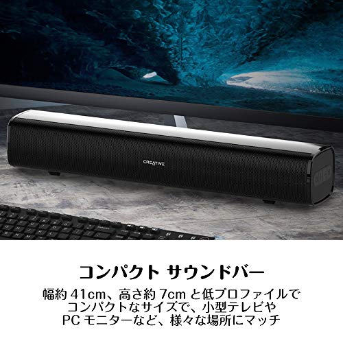 Creative Stage Airは、コンパクトな低プロファイル デザインで、フラット パネル ティスプレイの下や前への設置など、様々な場所にマッチするアンダーモニター サウンドバーです。