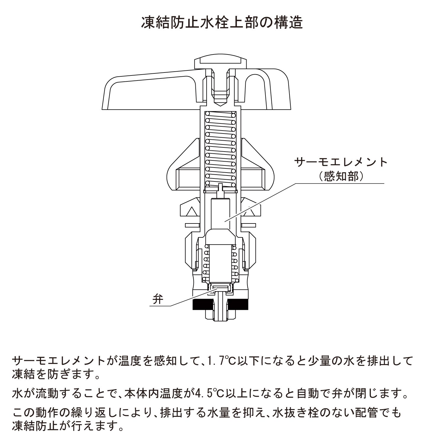With the function of the thermoelement, it opens at the temperature inside the main body of about 1.7 ° C, drains a small amount of water, closes at about 4.5 ° C