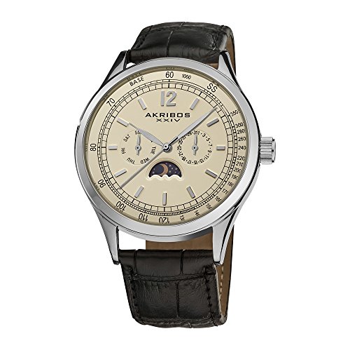 -. Title : Akribos XXIV Men's AK638SSW Retro Multi-Function Stainless Steel Black Leather Strap Watch