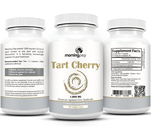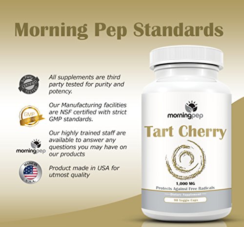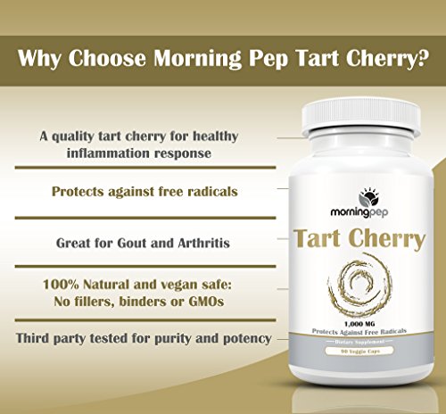 - Feature : Morning Pep High Potency TART CHERRY Supplement Is Backed By A 90 DAY SATISFACTION OR MONEY BACK, Purchase With Confidence Knowing That We Only Source The Absolute Best Quality TART CHERRY Available / Morning Pep Tart Cherry Supports Immune system Function, Cardiovascular Health, Eases Inflammation And Gout Pain, helps Fight Free Radicals And Is A Rich Antioxidant. / Morning Pep Tart Cherry Has Been Proven To Be Effective In Easing Gout Pain, Arthritis Pain, Joint Pain, And Any Other Inflammation Pain / Morning Pep Tart Cherry Is Naturally Packed With A Number Of Powerful Antioxidants Including Flavonoids Phytonutrients and Anthocyanins A Rich Antioxidant With A Potency Of 1000 Mg / Morning Pep TART CHERRY Veggie Capsules Are Preservatives, Gluten, and GMO free. Manufactured And Packaged In The USA In a GMP Approved Facility for purity and potency