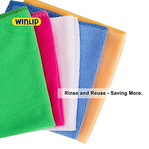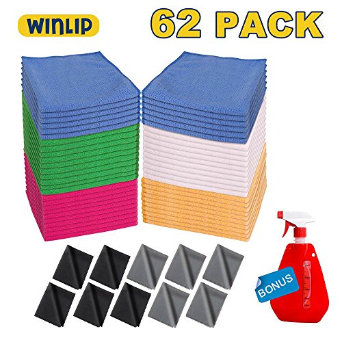 -. Feature : Winlip 62 pack cleaning cloth set includes 52 pieces of 12" x 12" size, 10 pieces of 6"x7" size cleaning cloth and 1 bonus spray bottle. 12"x 12" size version cloths are for any surfaces cleaning and 6"x 7" size version cloths are for eyeglasses, sunglasses, camera lenses, computer screens, televisions, and other delicate surfaces. / All the cleaning cloths are in microfiber material which is Super soft and non-abrasive. Microfiber cloth can be used on different surfaces and prevent scratching. Gentle enough to be used as a washcloth for your hands and face, strong enough for general household cleaning. / Size 12" x12" version :Attract dust, dirt and grime then trap them. Quick-Dry Dseign, No Streaks and lint-free. They are ideal for cleaning, drying, dusting and polishing with or without cleaner in household, garage, office and other cleaning. Size 6" x7" version: Extremely soft, high-quality microfiber material absorbs and removes dust, oil smudges, fingerprints, and dirt.e, strong enough for general household cleaning. / Assorted cloth colors help designate cleaning areas to avoid cross-contamination, such as the kitchen and bathroom. Eco-friendly and reusable, a big save. / Your satisfaction is our priority, so we will provide you with 100% satisfactory guarantee from products to service. No risk!