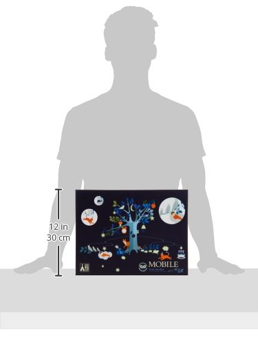 This mobile is 31.5 inches wide and 18.9 inches long with 12 elements that hang and 8 small elements that hang off of the tree. The packaging is a box with elements wrapped in tissue paper inside.