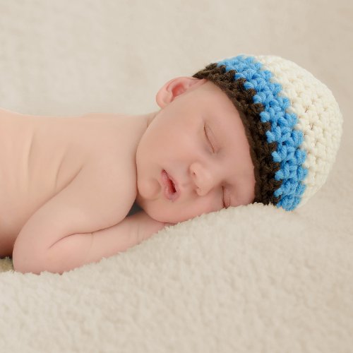 -. Feature : Sizes: Newborn to 12-24 months / Fall and Winter baby hat / Great colors - cream, blue and brown / Handmade in the USA of 100% soft acrylic / Warm baby boy beanie!
