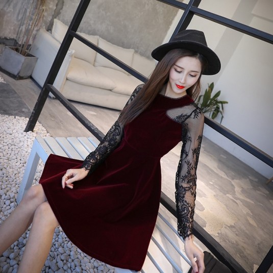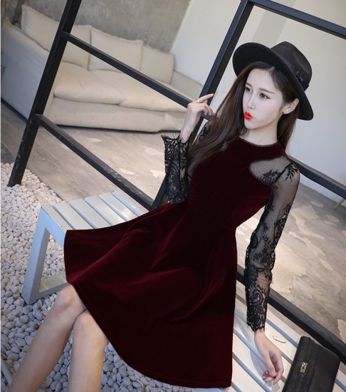 ワンピース レース 膝上丈 長袖 ハイウエスト シック 大人可愛い パーティー お呼ばれコーデ drgz1566