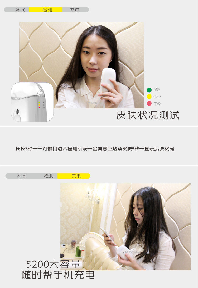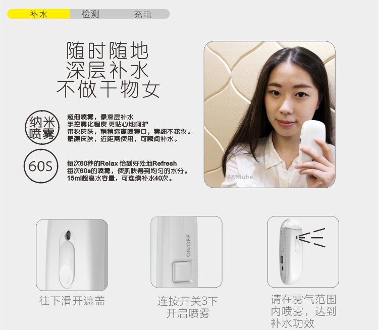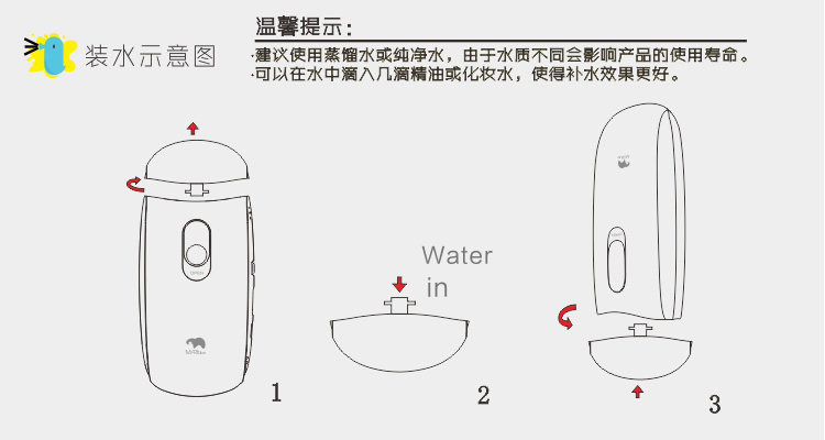 Recommends using distilled water or purified water, due to the different water quality will affect the life of the product. You can water a few drops of essential oil or lotion, make better replenishment