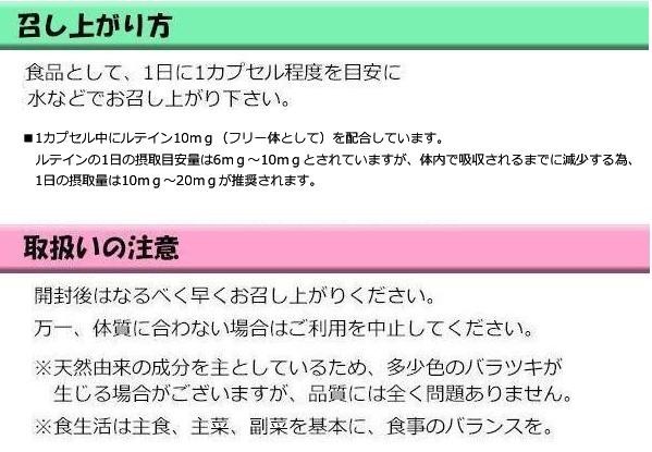 | 栄養成分 | (1カプセル450mgあたり)エネルギー2.735kcal、たんぱく質0.115g、脂質0.28g、炭水化物0.39g、ナトリウム0.031mg(食塩相当量0.00008g)、ルテイン10mg(フリー体)、ゼアキサンチン1mg、ビルベリーエキス末10mg |
