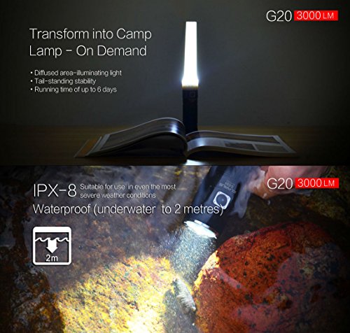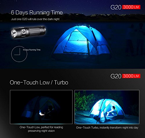 The G20 has four brightness levels: Turbo (3000 lumens), High (650 lumens), Medium (160 lumens), and Low (15 lumens)