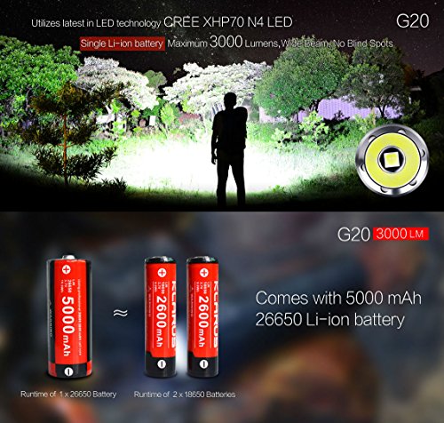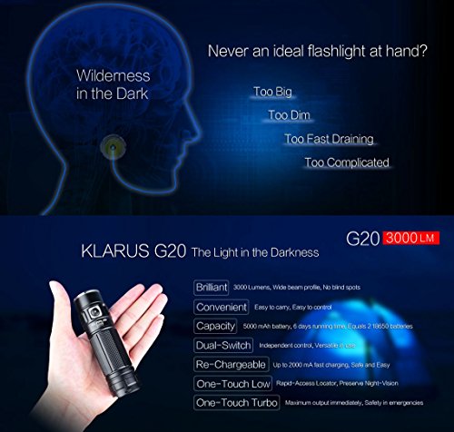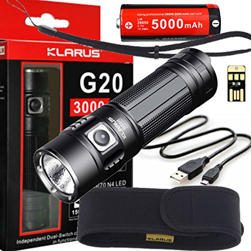 Klarus G20 SUPER BUNDLE Includes LED 3000 Lumen Flashlight, 26650 Rechargeable Battery, Holster, Lanyard, USB Charging Cable, and Mini USB light